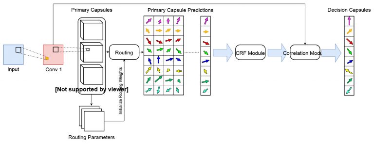 Recently proposed Capsule Network is a brain inspired architecture that brings a new paradigm to deep learning by modelling input domain variations through vector based representations. Despite being a seminal contribution, CapsNet does not explicitly model structured relationships between the detected entities and among the capsule features for related inputs. Motivated by the working of cortical network in human visual system, we seek to resolve CapsNet limitations by proposing several intuitive modifications to the CapsNet architecture. We introduce, (1) a novel routing weight initialization technique, (2) an improved CapsNet design that exploits semantic relationships between the primary capsule activations using a densely connected Conditional Random Field and (3) a Cholesky transformation based correlation module to learn a general priority scheme. Our proposed design allows CapsNet to scale better to more complex problems, such as the multi-label classification task, where semantically related categories co-exist with various interdependencies. We present theoretical bases for our extensions and demonstrate significant improvements on ADE20K scene dataset.